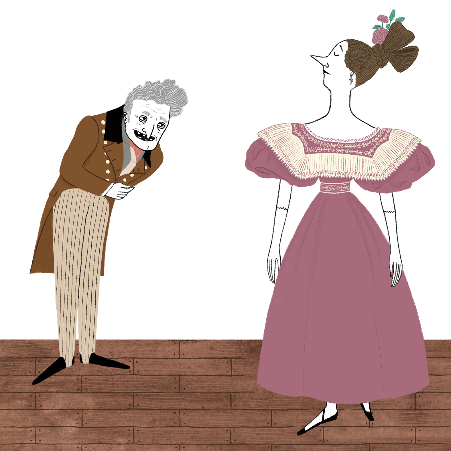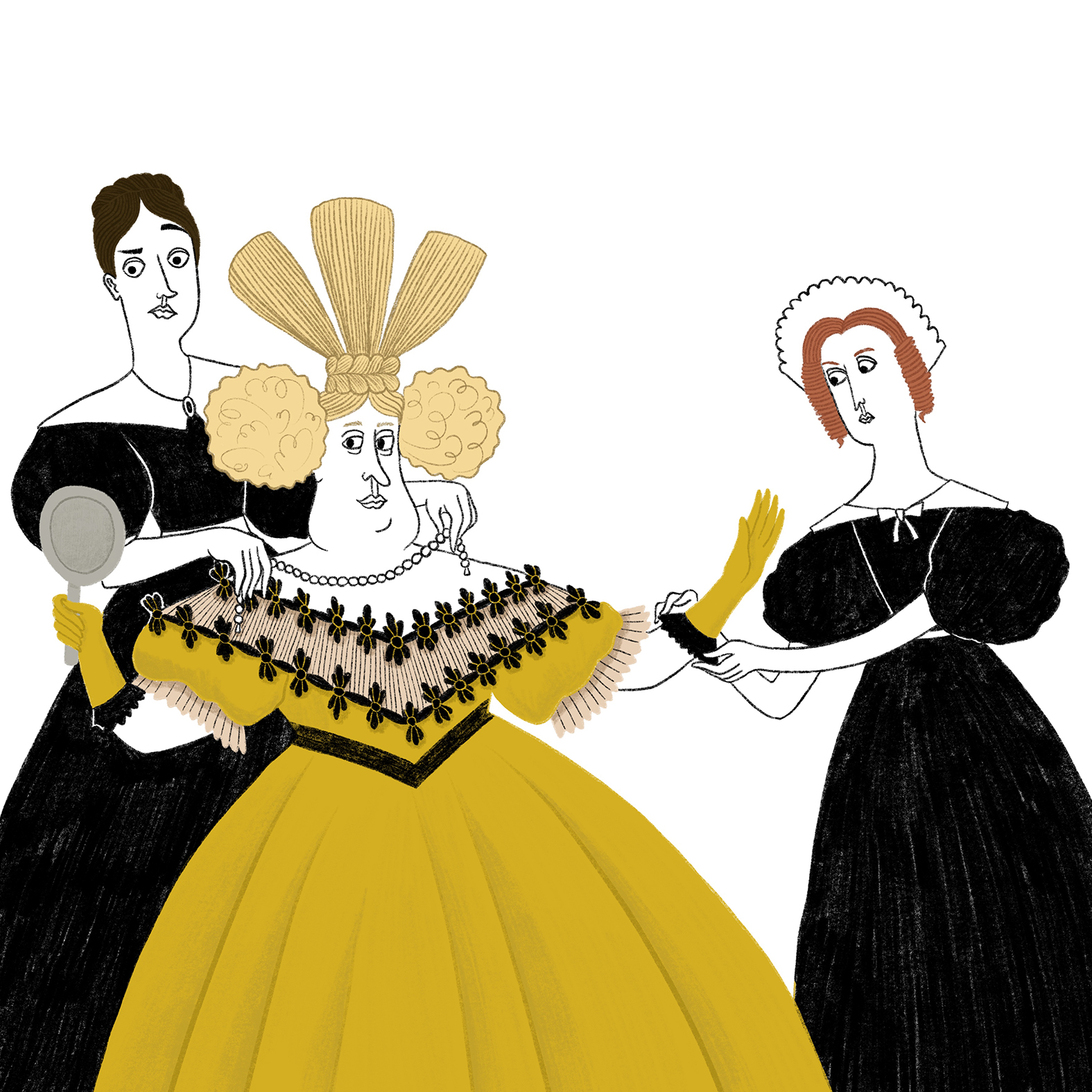 Personal project. Set of three illustrations exploring 1830s fashion and character design.